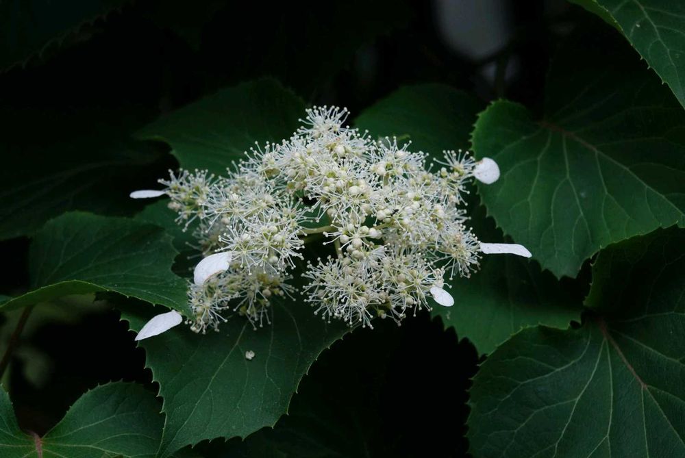 ツルアジサイとの違いはイワガラミは花弁が1枚、ツルアジサイは4枚。葉はイワガラミの鋸歯よりツルアジサイは細かな鋸歯のようです。