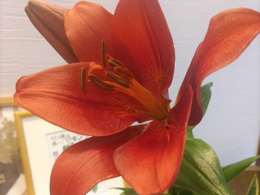 ユリが咲いたかと思うと重さで折れていた。真っ赤なユリ。