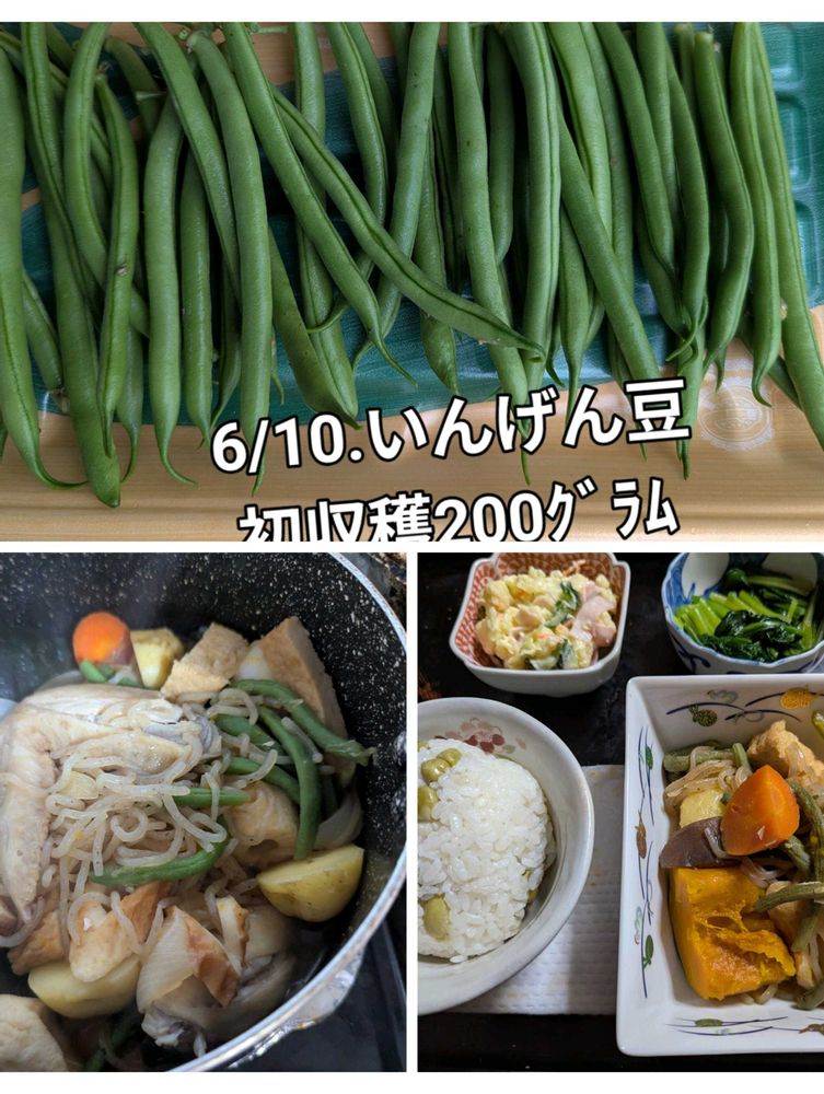 6/11.気温19度、今朝も雨☔我が家の花と野菜、いんげん豆初収穫美味しく頂きました😋次は天麩羅