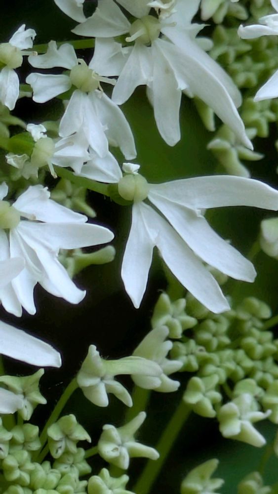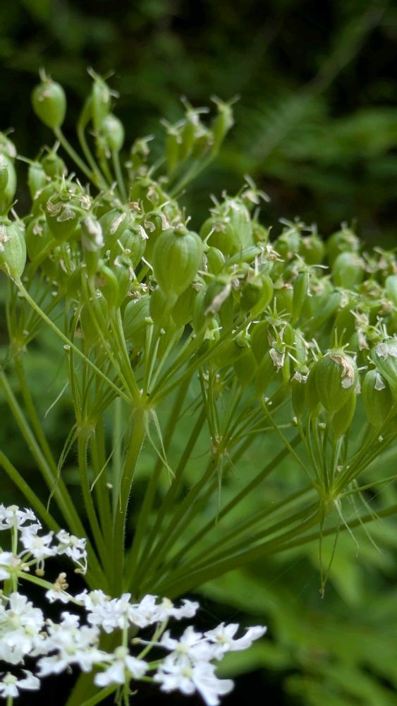 散形花序といって、いくつかの小さな花の集まりが集まって全体の花の形を作っていてる♪ 頂部の花は両性でよく結実して、早くも若い緑色の実がふさふさと育っている🟢