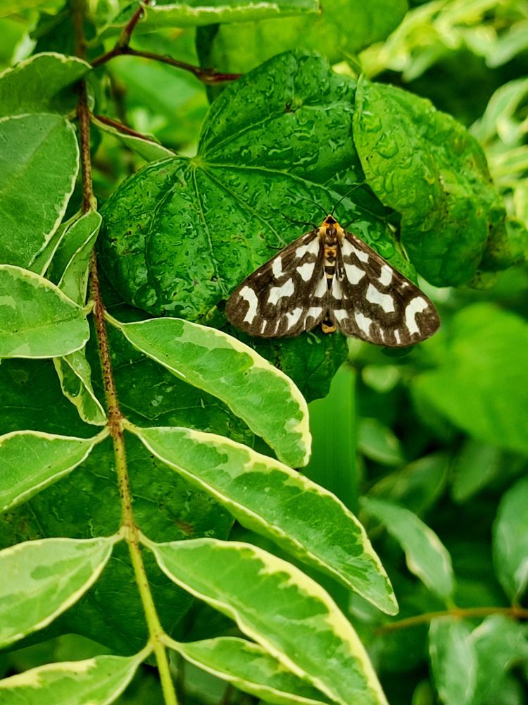 最近よくいる蝶っぽい蛾、ウメエダシャクが木に止まっていたのでパシャリ。