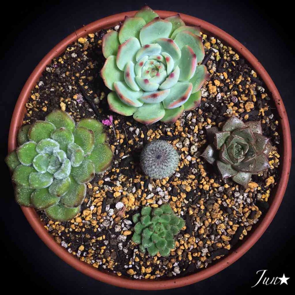 以前アップしたエケベリアの寄せ植えです。コロラータが大きくなってここだと窮屈なので先日別鉢に植え替えました。空いた場所にキャロルというエケベリアを植えました。店に一個しかなく、砂糖みたいなのが表面についてるような見た目もかなり奇抜だったので予定外にも買ってしまいました。今は少し弱々しい感じですが、これから元気に成長してくれたらと思います。