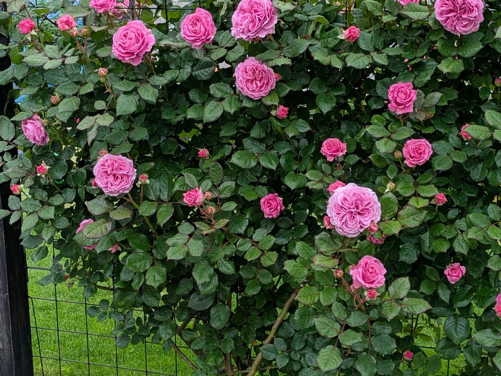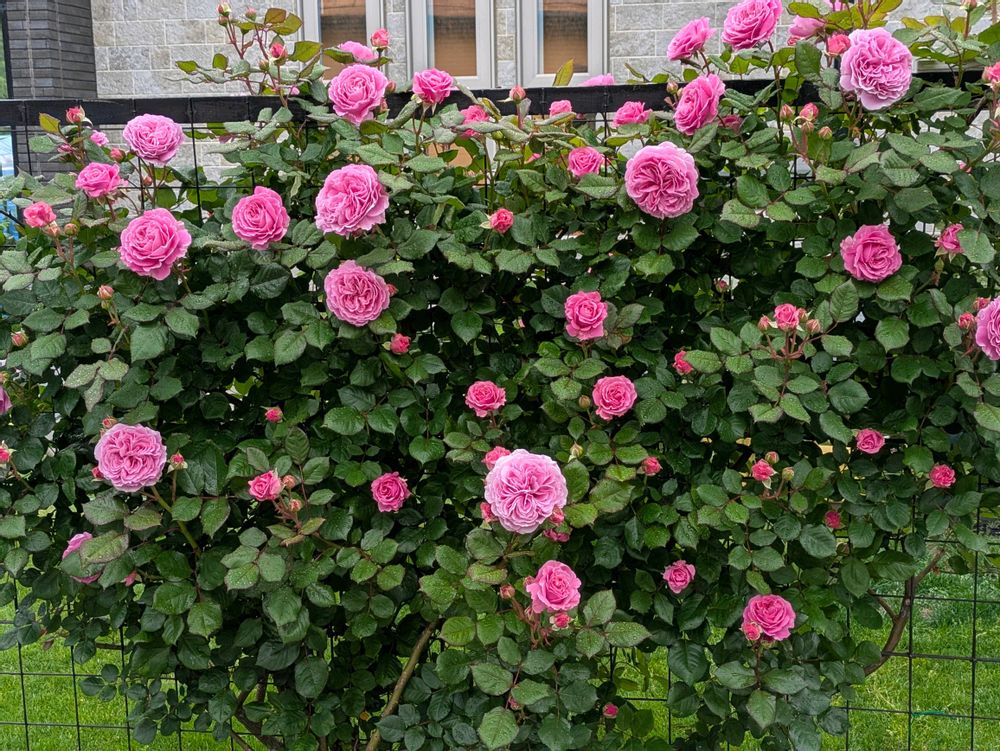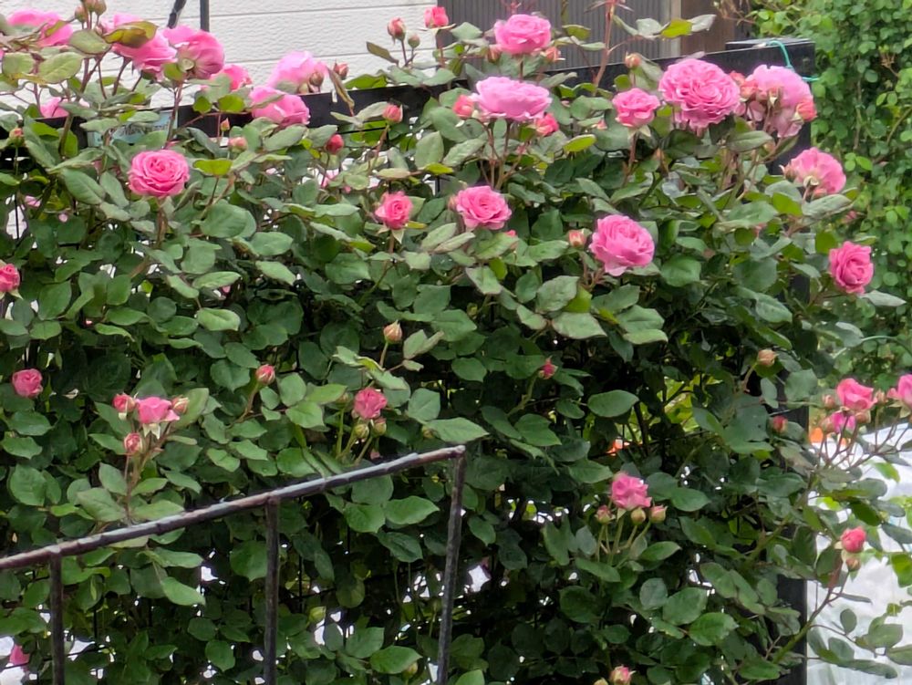 昨日の暑さに感応してバーン✨と咲き出していたマリーヘンリエッテ💕ピンクの巻き巻き女王様。房咲きで更にボリュームアップです😍1枚目は南側から3枚目は北側。でも普段見るのは北側。裏側?表側?より美しいのが表側ということにしておきましょう😉