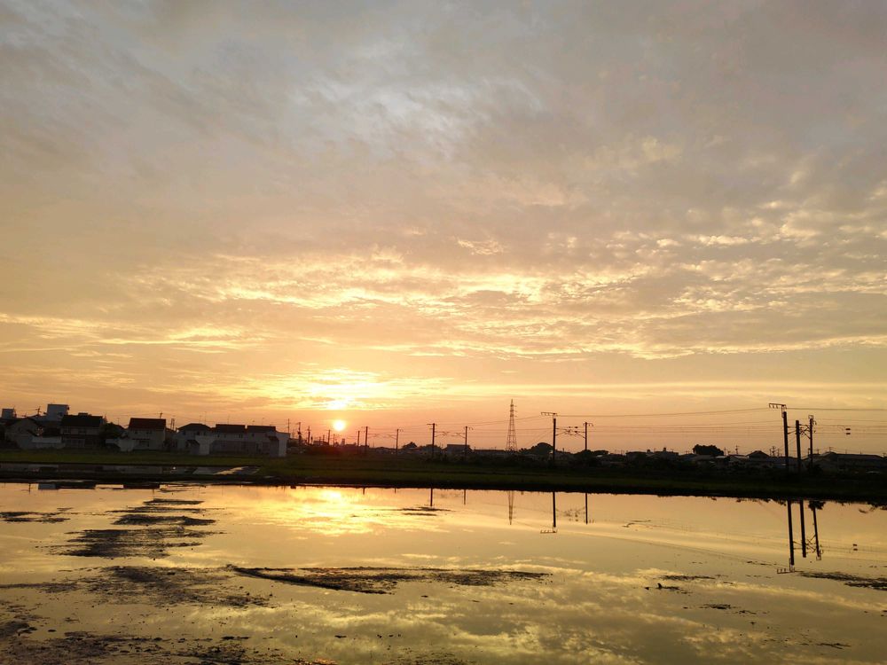 梅雨時なのに、明日は雨降りだと言ってたのに、こんな綺麗な夕陽が見られて、夕飯途中にスマホ持ち慌てて飛び出し、私達の住宅の下のアパートの駐車場で、写させて貰いました。綺麗で、いつもより太陽が大きく見えて綺麗でした。