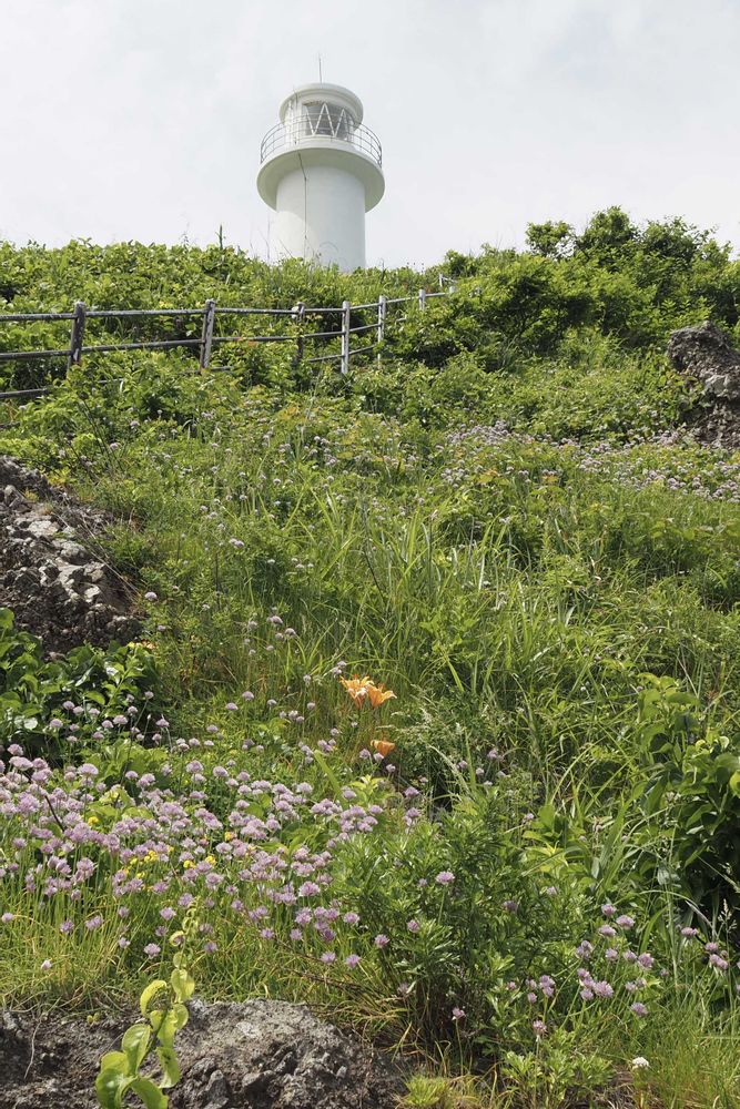 灯台の周りは花盛りです。ポンポン状の淡紅紫色の花はアサツキ。紫色はウツボグサ 。白い花はハマボッス、黄色い花で小さい方はメノマンネングサ、大きい方はキリンソウです。今は淡紅紫色と白色が盛りで、絨毯の様に咲いています。黄色はコレからです。