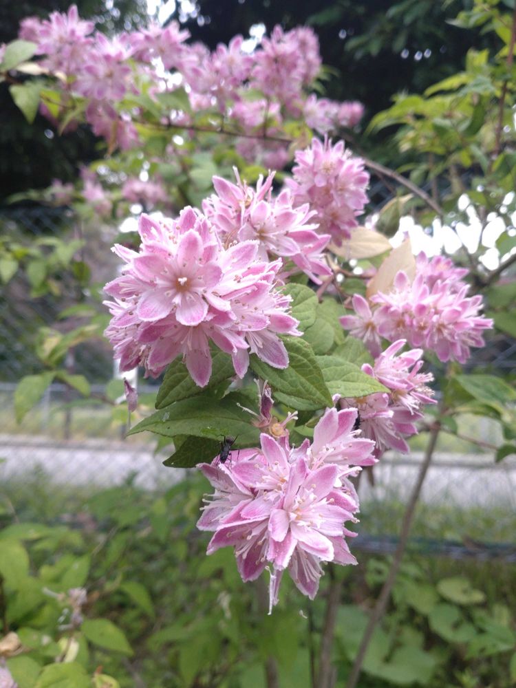 サラサウツギと思ってましたが、花弁が平開し、ウツギとは違っています。調べてみますと、サクラウツギのようです。学名は、Deutzia x hybrida Lemoine となっていて、中国原産の D. longifolia Franch. と D. discolor Hemsl. との交雑種との事です。