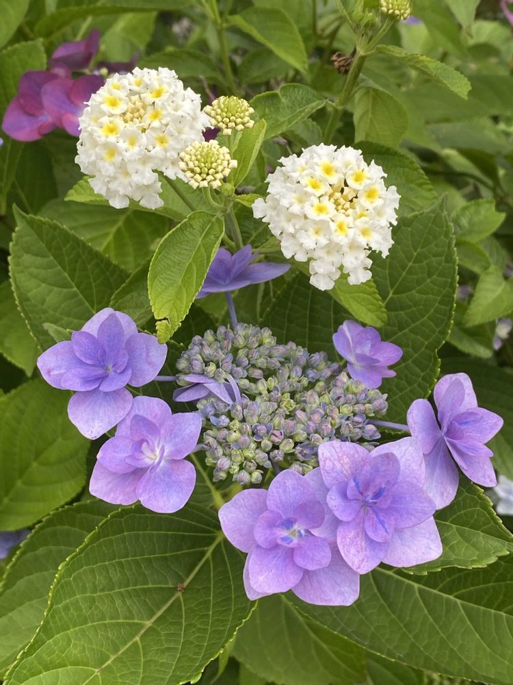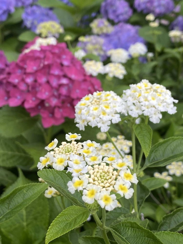 紫陽花との相性は、白いランタナがベストマッチだと思うのですが、いかがでしょうか😊💚🤍💙💜❤️💕