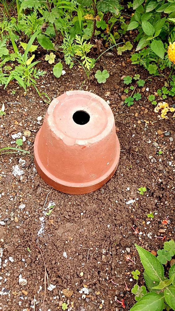 5/2に4本挿し木したコバノランタナで珍しい赤紫色ですが、1本だけ発根したので、今朝花壇に植え替えしました。しばらくは直射日光を避けるため、植木鉢を被せておきました😅2枚目