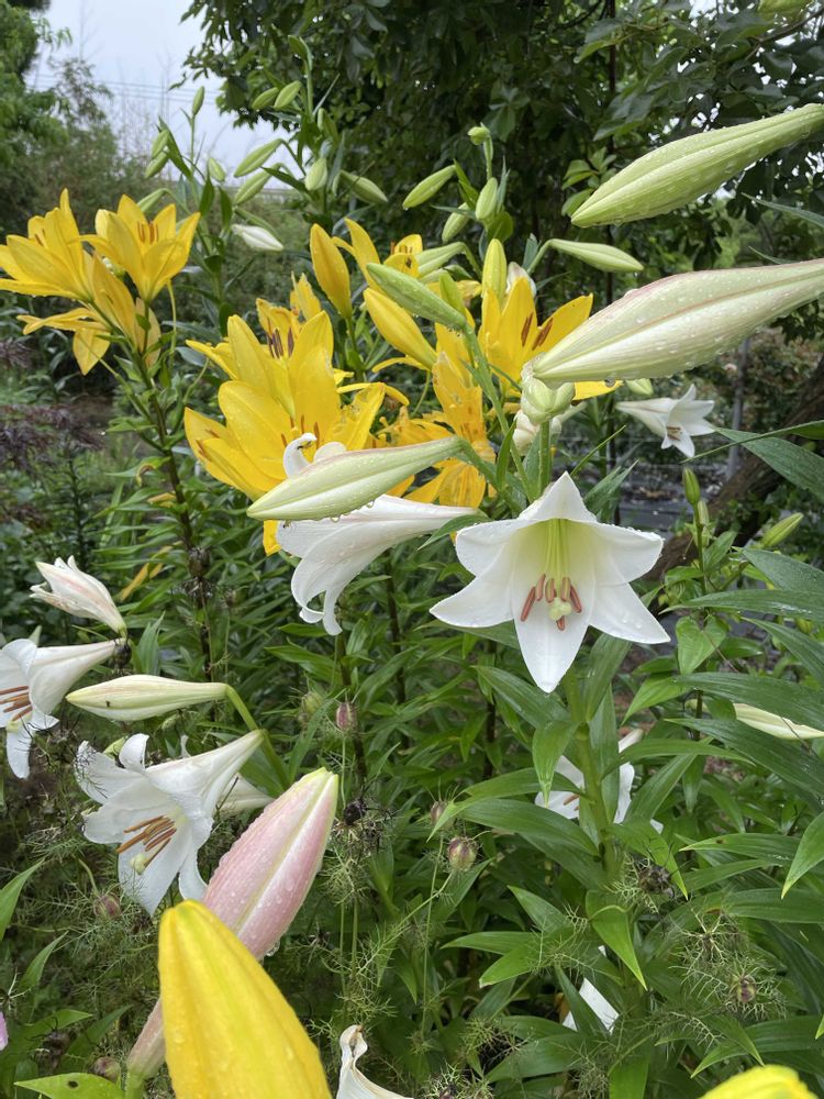 白のテッホウユリも黄色いすかしゆりも元気に咲いています