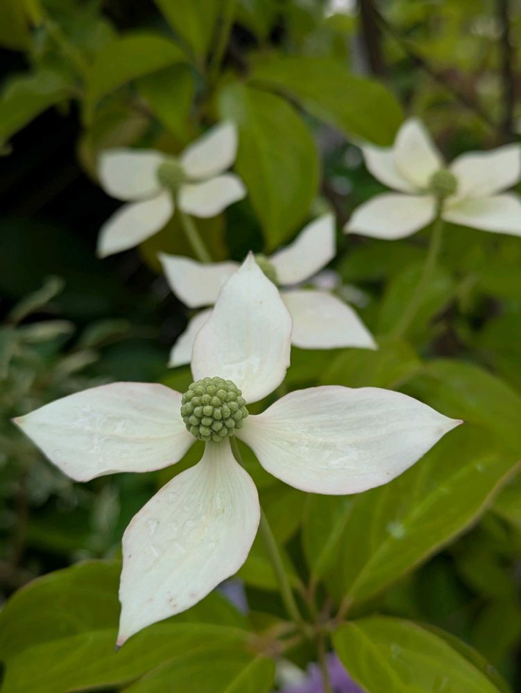雨上がりの紫陽花の上で、ヤマボウシが満開です