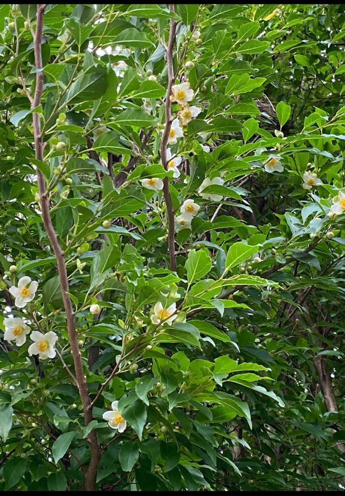 ヒメシャラの木はとんでもなく大きくなりそうな勢いでしたので 4年くらい前にストンと主幹を短く切ったのですがまた伸びてお花をいっぱい付けています✨