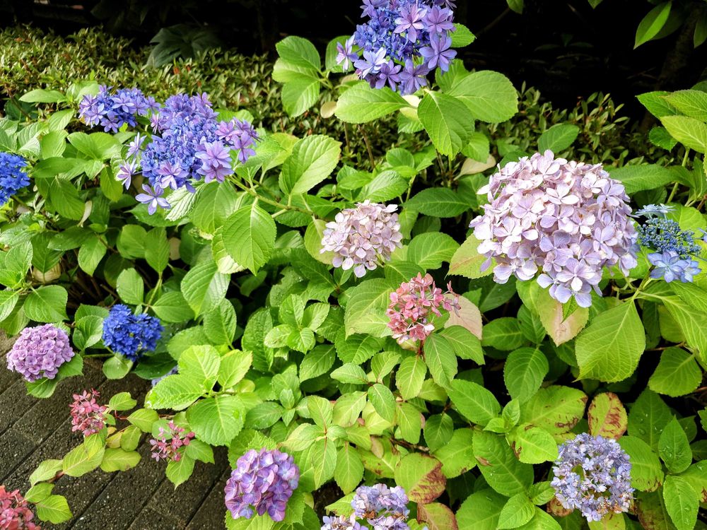 鉢植えの紫陽花をまとめて庭の片隅に集めて、紫陽花畑にしましたよ😊
