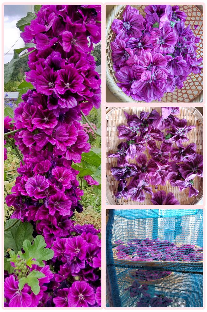 今年のマロウは花たくさんつけました。朝に花を摘んで、よく洗い、すぐザルに乗せて乾燥させてます。