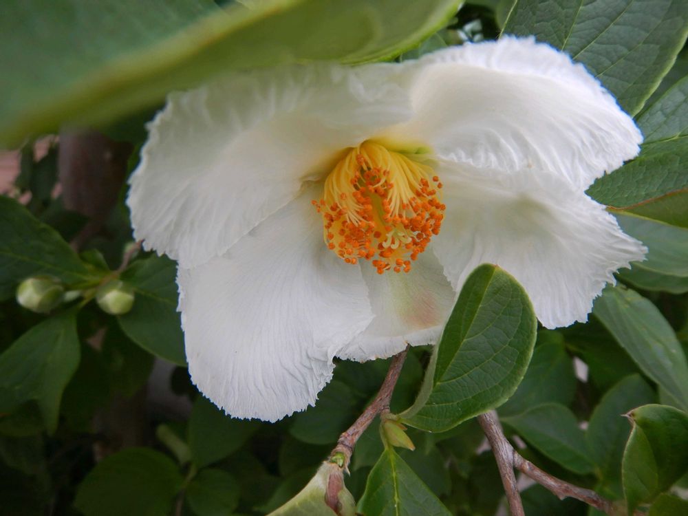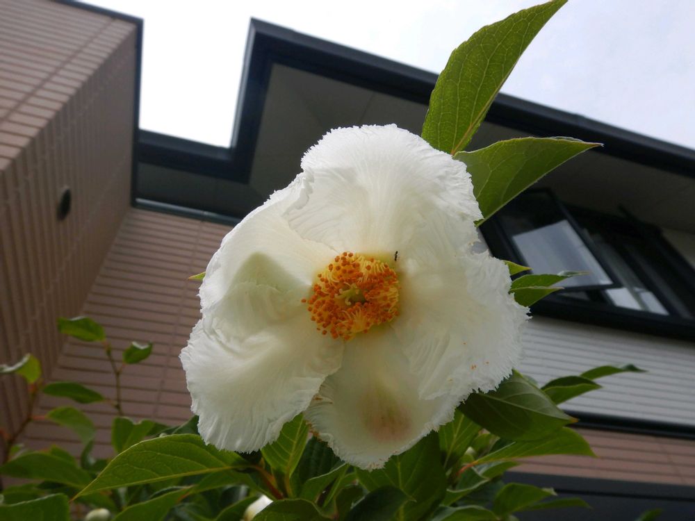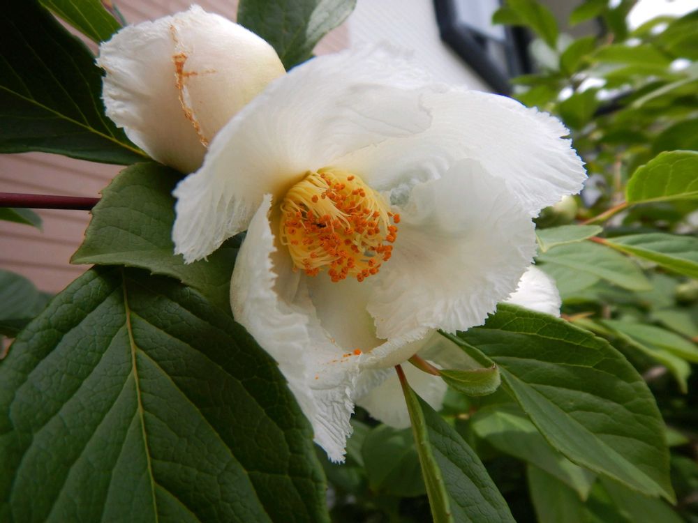 玄関横でナツツバキの真っ白な花が開きました。🌼🌼🌼