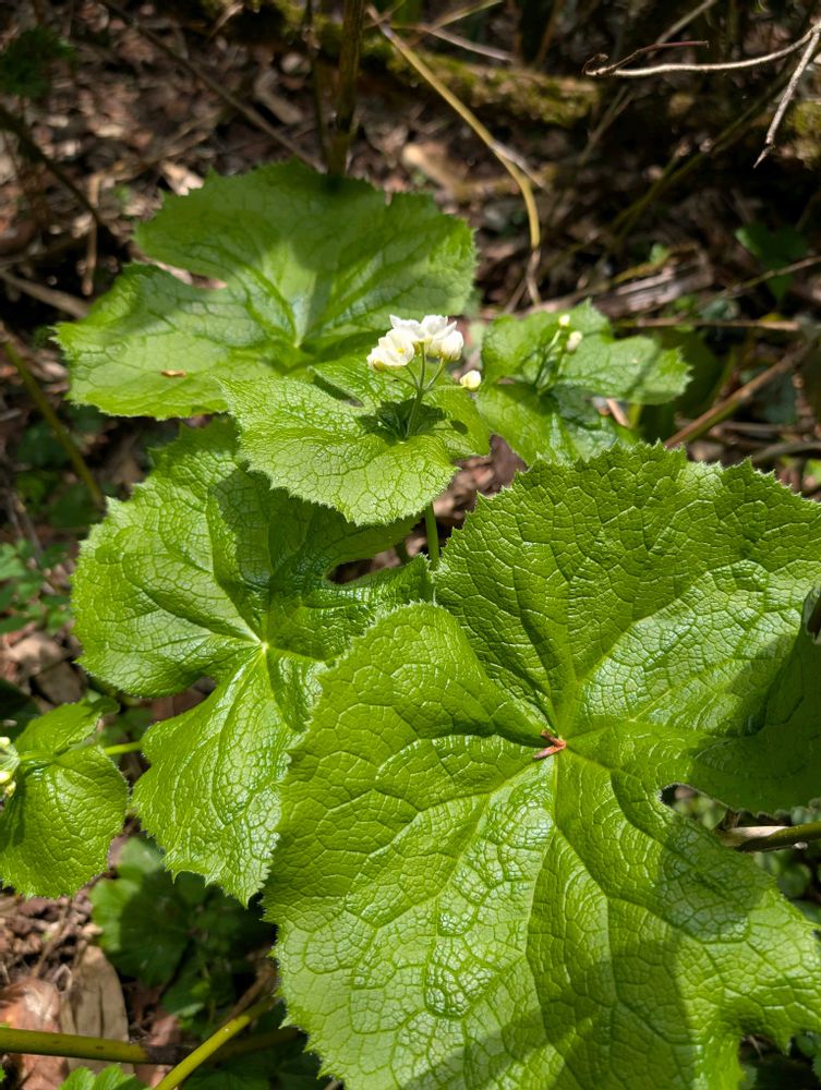基部と先端が切れ込んで、大小2枚つく葉は大きくフキのような形をしている。