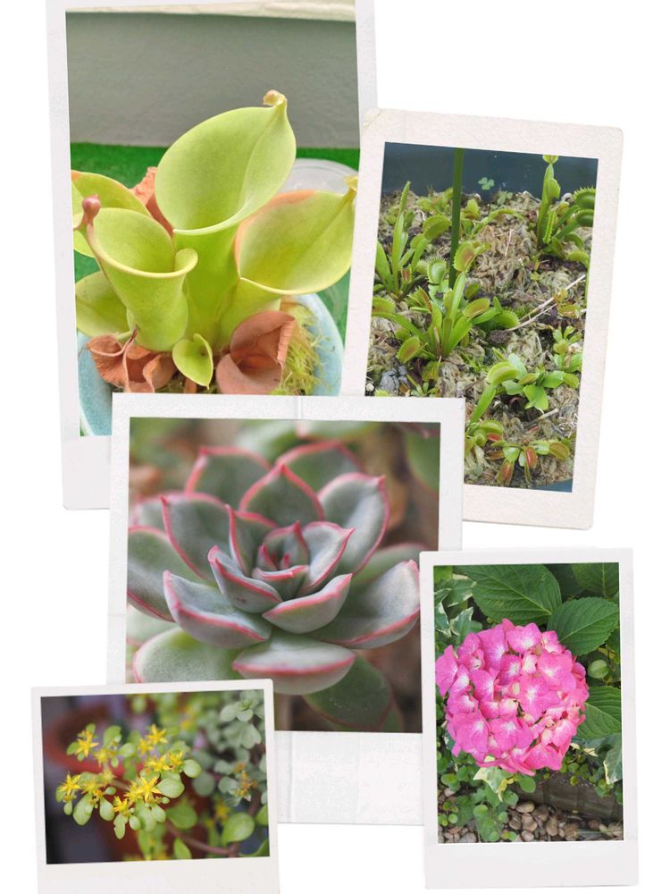 ヘリアンフォラ、ハエトリソウ丼、エケベリア ヘラクレス、何だったっけ?、紫陽花