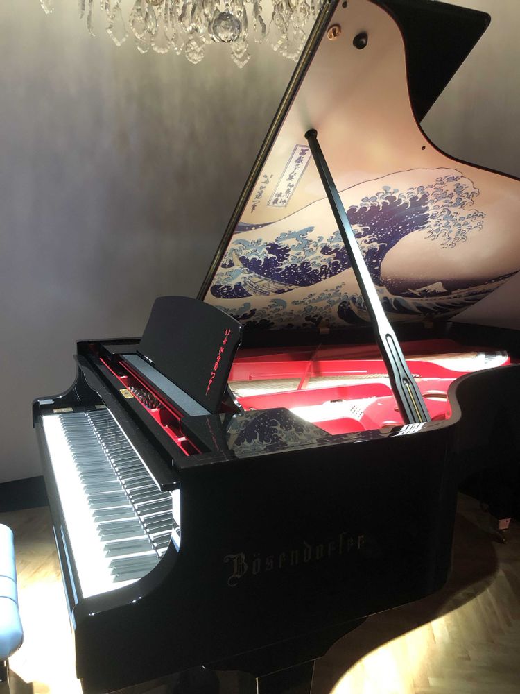 ※1869年にオーストリアの皇帝から明治天皇に献上されたというベーゼンドルファー社のグランドピアノ「エンペラー」のレプリカ展示です。葛飾北斎の絵がデザインされており、世界で16台しかないピアノ🎹です。🌞✌️