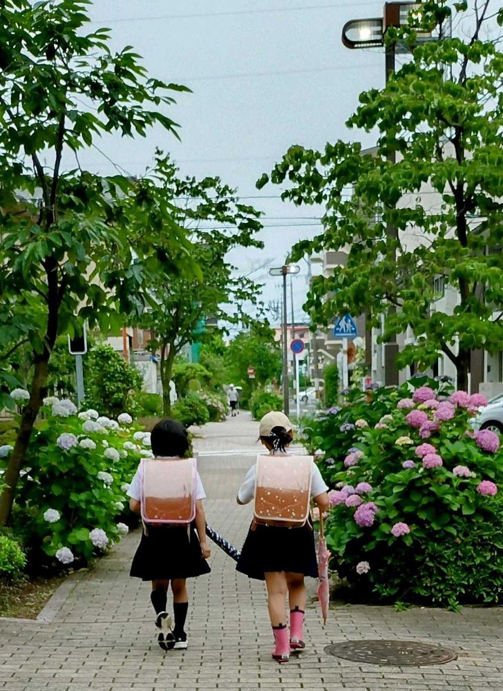 鮮やかさを増した紫陽花の道を子供達が下校して行きます