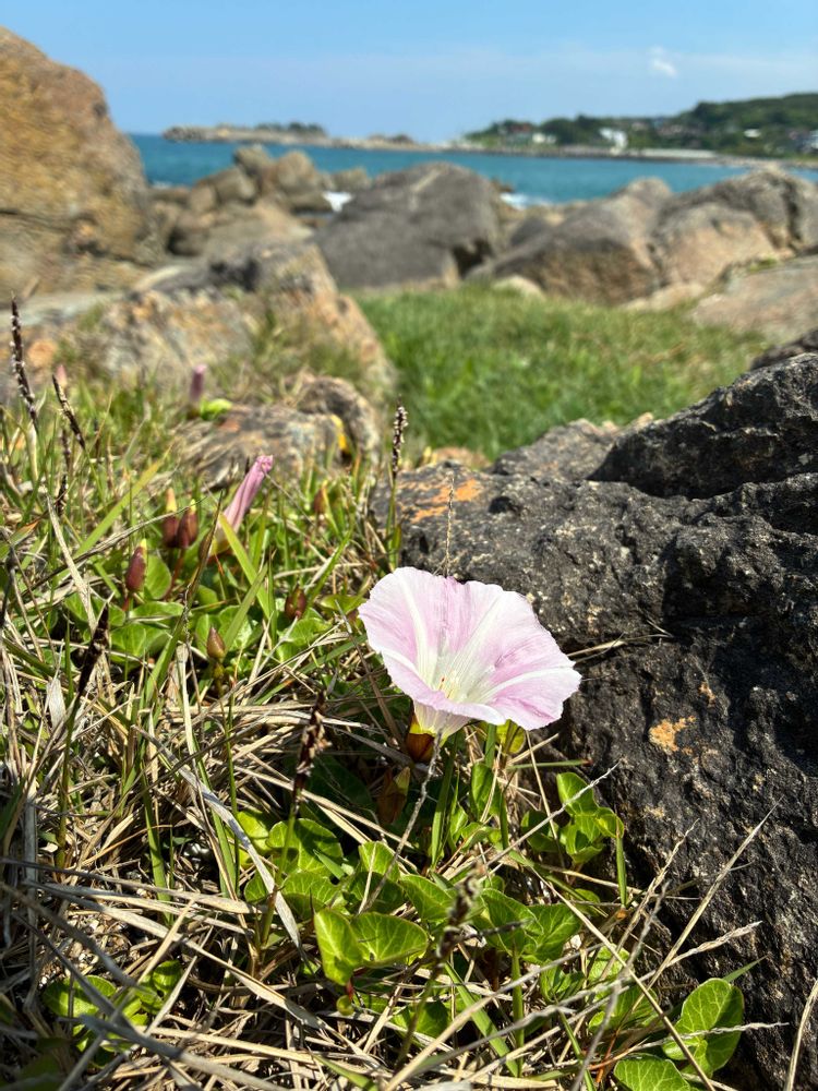 岩場のあちこちに葉っぱが這っているけれど、花の数は控えめ。種差海岸の岩場はいろんな植物と譲り合って咲いているよう😊
