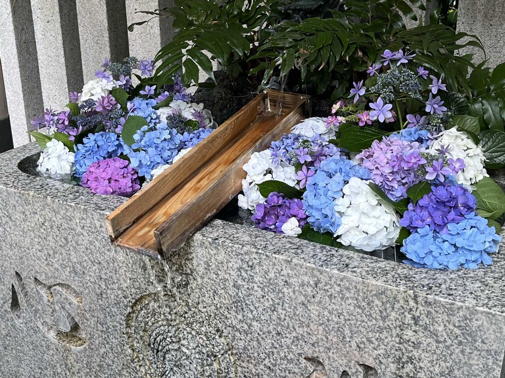 出勤前にお詣りしたら、紫陽花の花手水に癒されました。