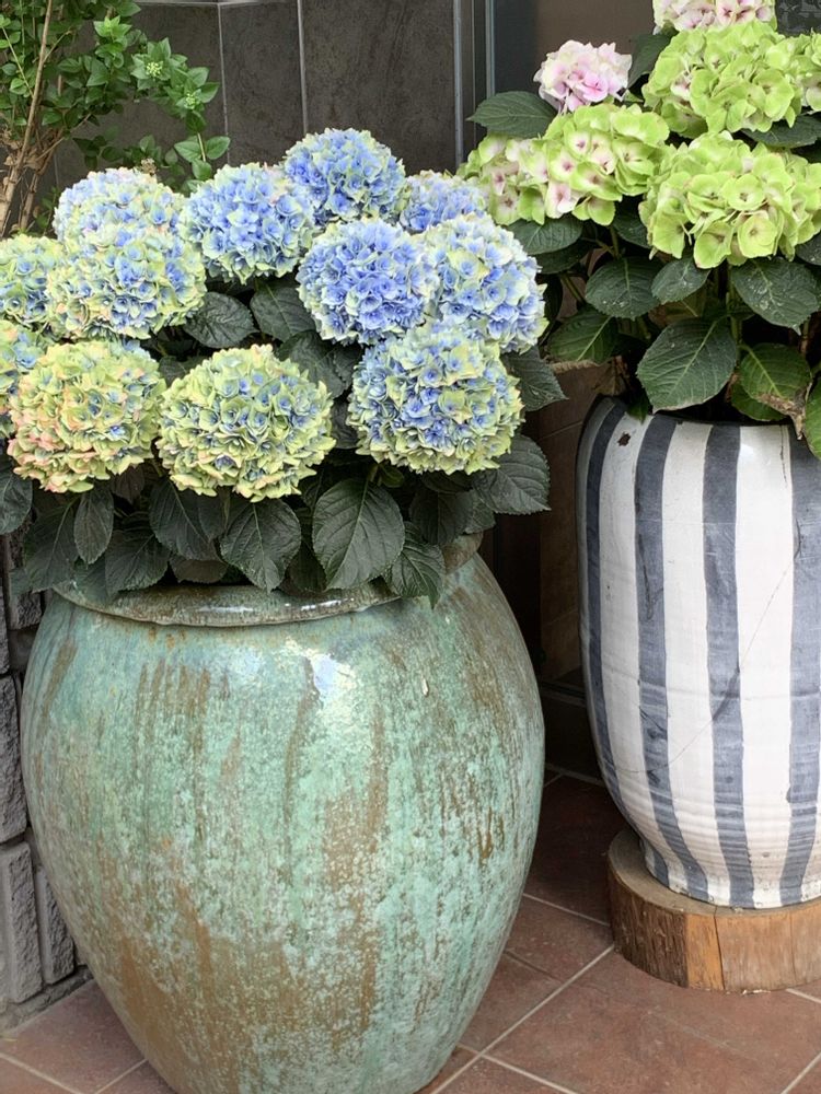 通勤途中のマンション前に大きな壺に飾られているアジサイ