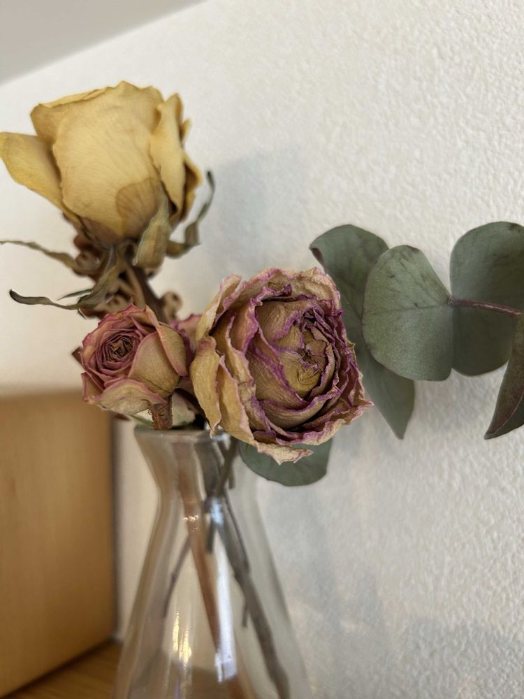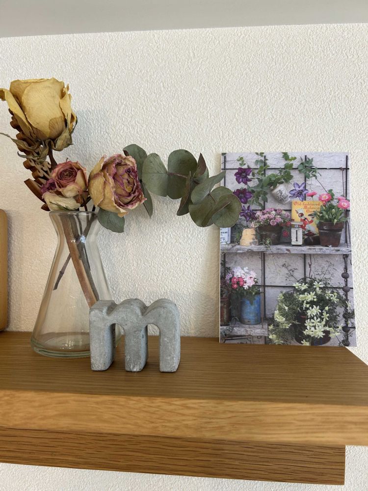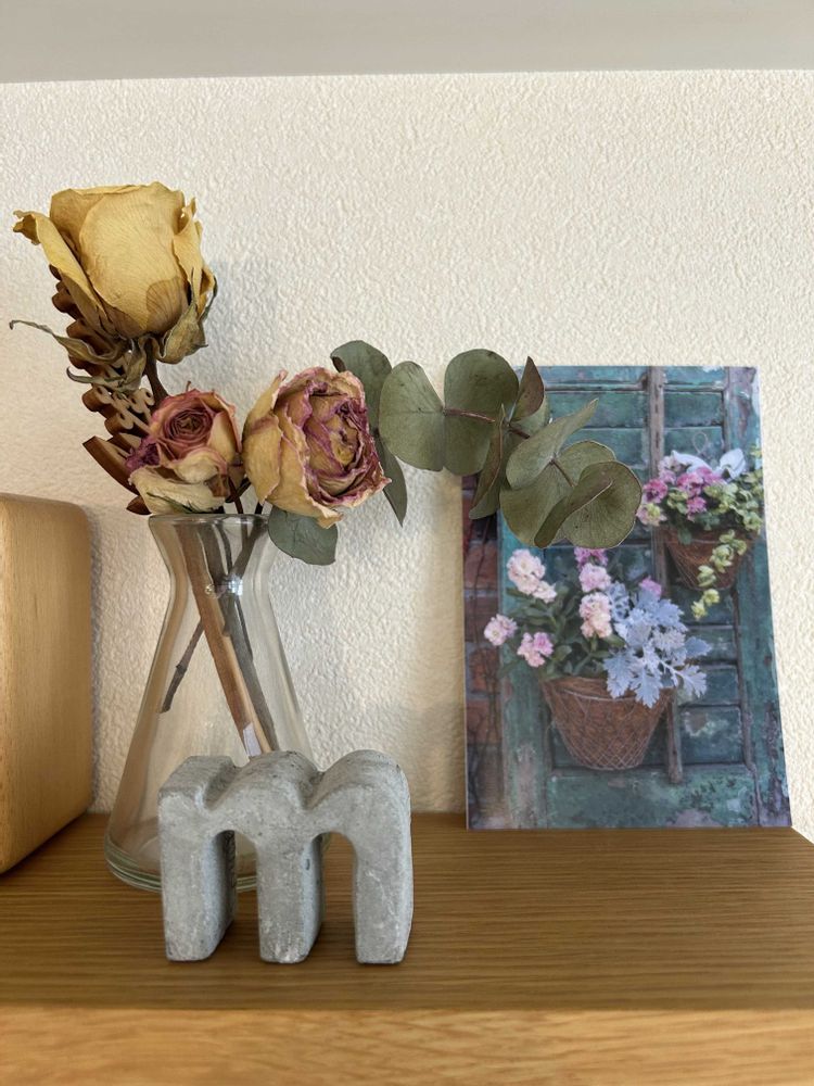 キッチンの棚にバラやユーカリをちょこっとドライフラワーにして飾っています。
