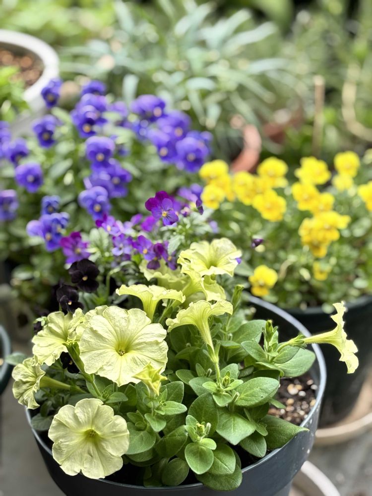 ①②庭のビオラの鉢に植え付けたペチュニアが咲いてきて、切り戻し後復活して頑張っているビオラと共演しています😊