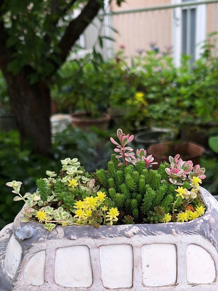 古いネコバス鉢のセダムの寄せ植えが、綺麗になってきました❕😄✨