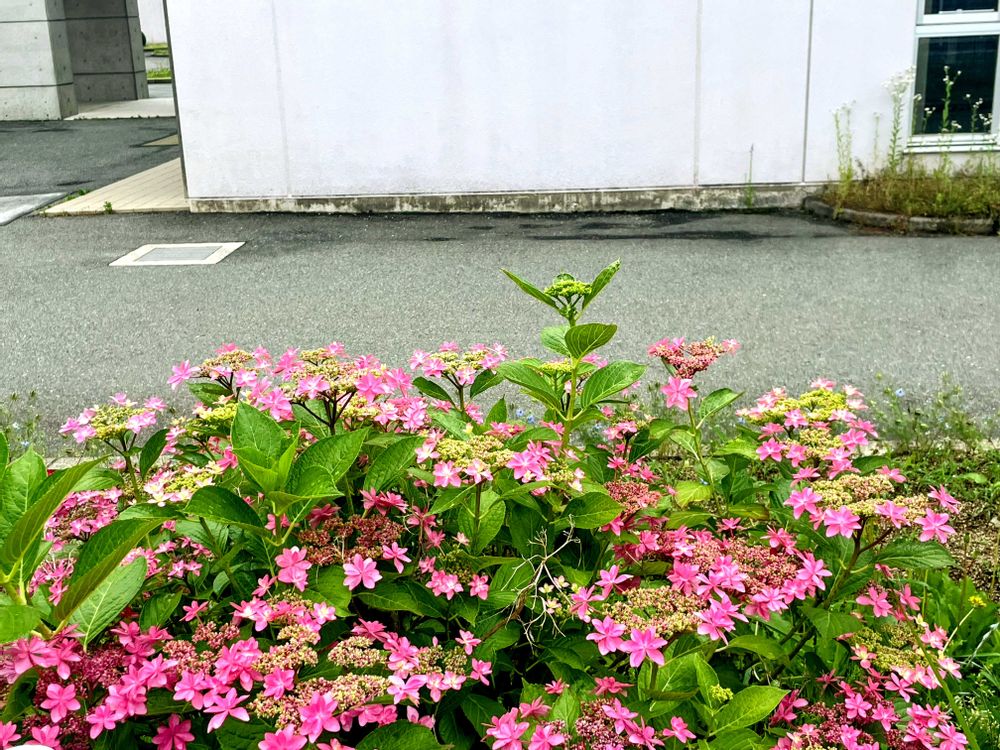 m&oさんの買い物へ行く途中で,白石中学校の花壇に,赤とピンクの紫陽花の投稿画像
