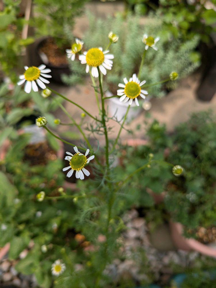 梅雨の中休み☁にようやく開花してきたハーブ🌿ジャーマンカモミール🌼