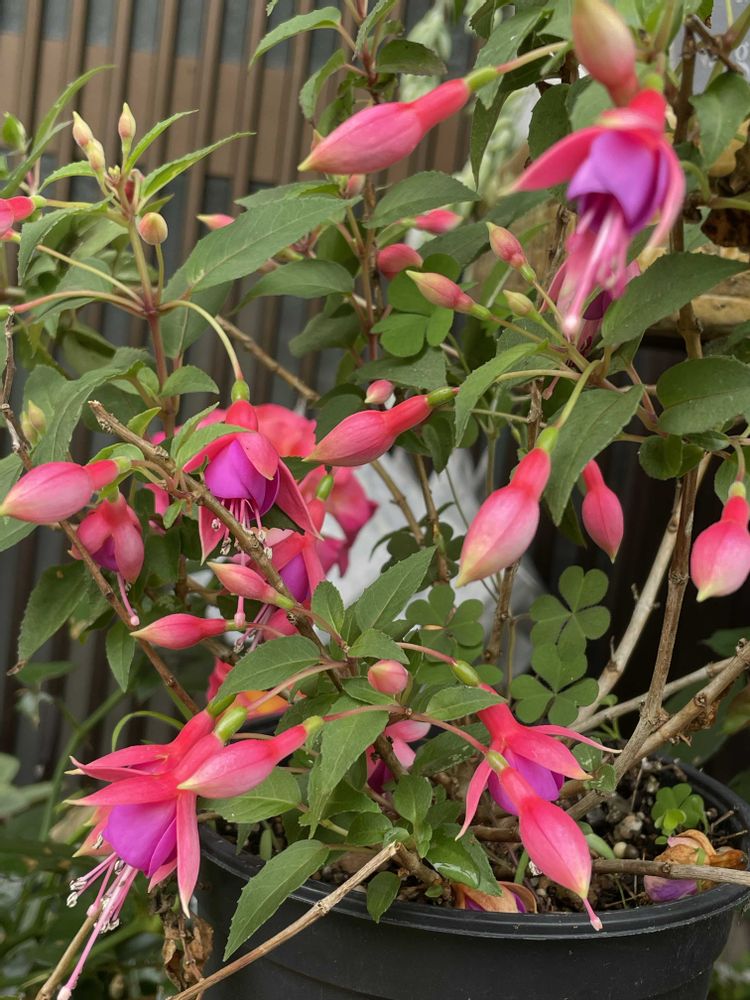 フクシア、植物園で下がってるのを見て、きれいなのにわーってなったよ^_^家でもきれいに育ててるからいいな🙋♀️