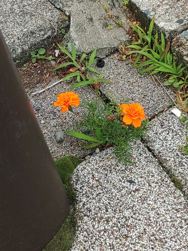 自転車で信号待ちしてる時、下を見ると…ど根性マリ―ゴ―ルドが咲いてました💚🧡🧡🧡💚