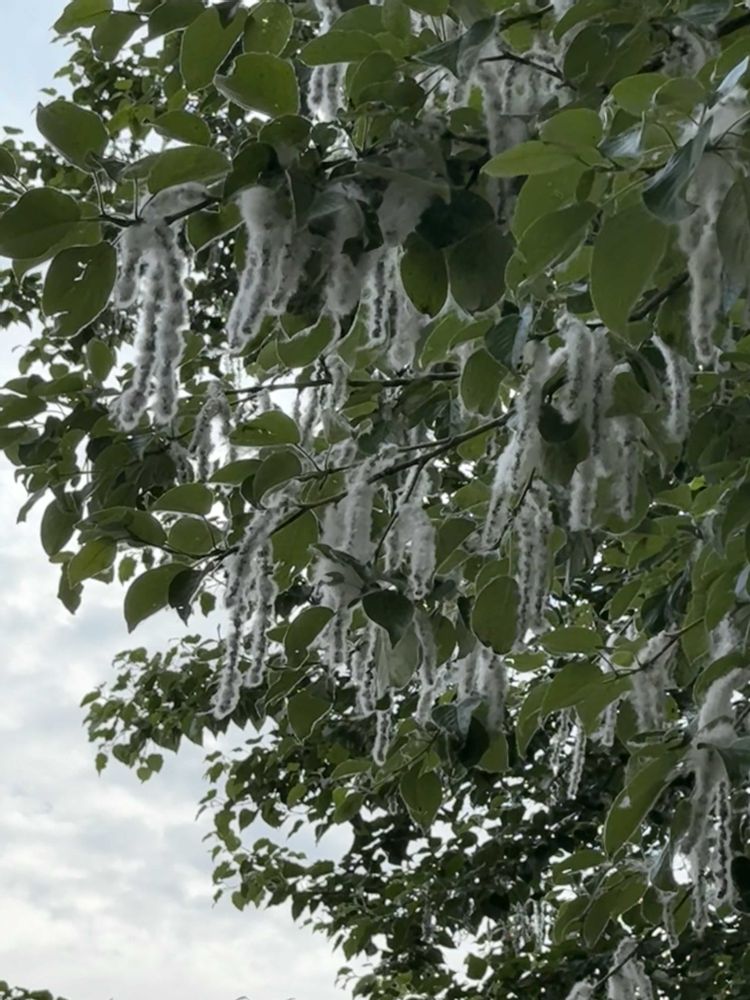ニセアカシア(ハリエンジュ)の綿毛が雪のように降り積もっています。