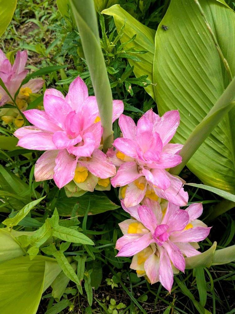 にんにくの花は、上のピンクの部分は苞葉で、下の黄色い部分が花だとか。