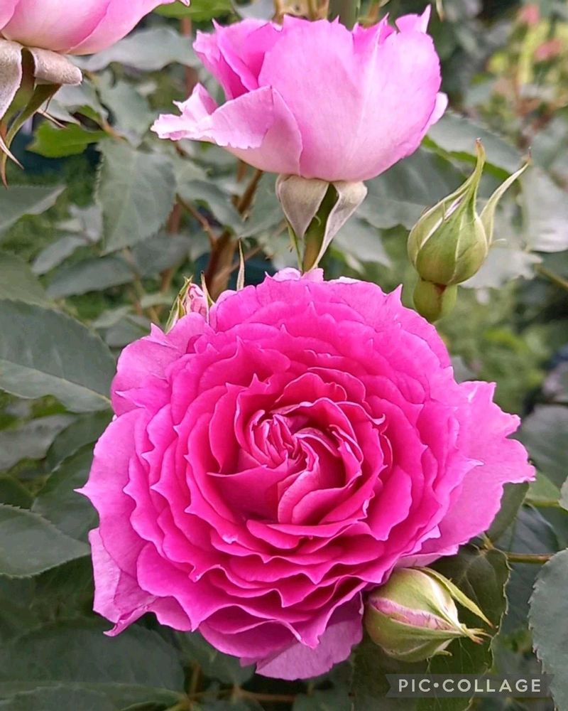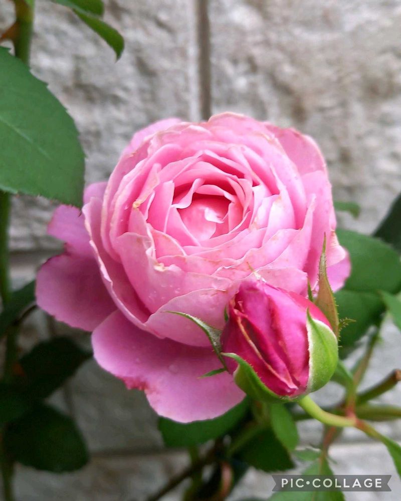濃いピンクに薄いピンクの絞りが入る大輪のバラです🌹