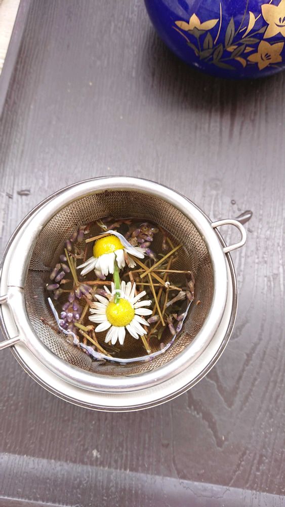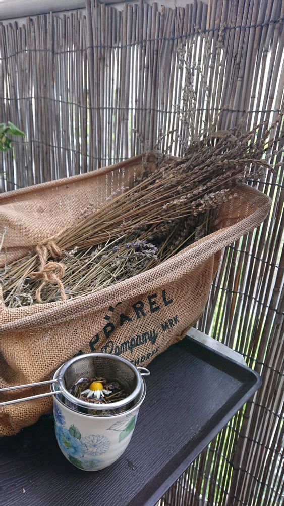 去年収穫しておいたラベンダーのドライハーブに、摘み立てのカモミールを入れてハーブティーに😊