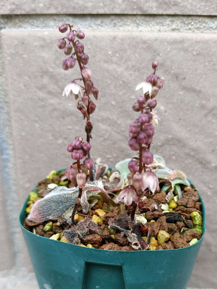 ④冬の間モケモケの葉を展開していた毛羽玉さん。葉が枯れ始めてからお花が咲くのね。去年咲かなかったから、初めて見る下向きのお花。