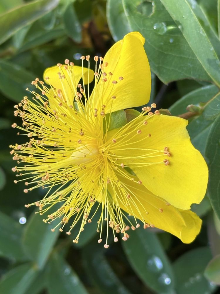 Hypericum prolificum/Hypericum. Hyperiaceae. Malpighiales. Magnoliopsida. Tracheophyta Commonly called/St.John’s wort’ eastern Native to/Central and eastern North America Symbolism/Protection. Rebirth. Good Luck *Genus of more than 400 species *Tufted perenial with stiff, 2 ridged stems bearing opposite, mid-green leaves, 1 1/4in(3cm)long. Bright yellow flowers, 1/2-1 1/2in (1.5-3cm)across. *The genus ‘Hypericum’ is Greek words meaning ‘over’ and ‘apparition’, supposedly for the plant’s ability to ward off evil spirits. *The Greek physician Hippocrates was one of the first to document therapeutic use of SJW(St. John’s wort). Photographed 6/12 9:10am 2025 Posted 12:09p 6/13(Friday) 2025
