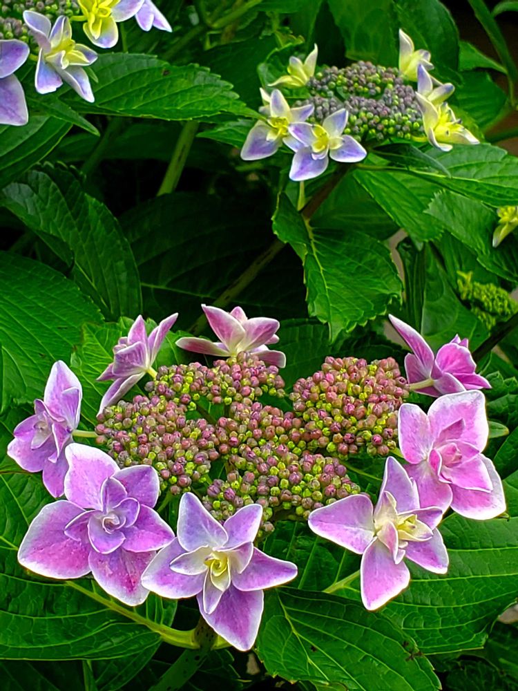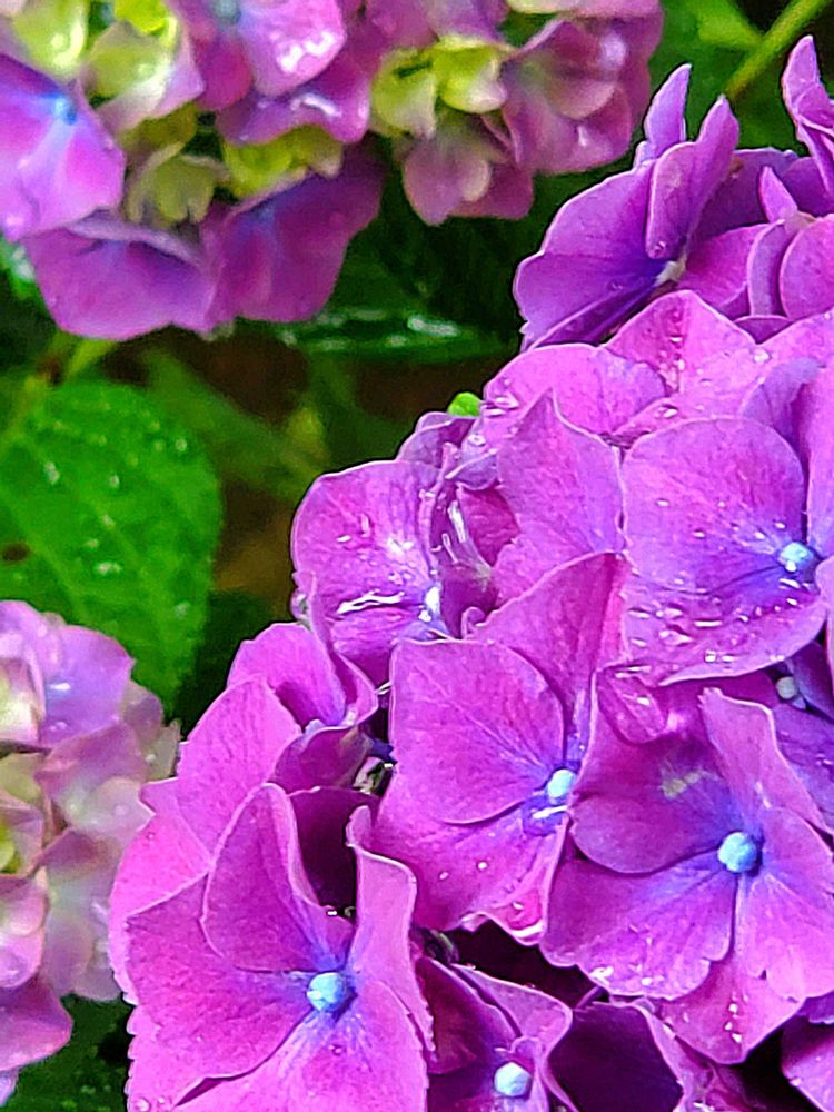 可愛い花色の紫陽花さん梅雨空に輝いていますね💚💜💚今日も素敵な一日にして下さいネ🤗💐💐💐