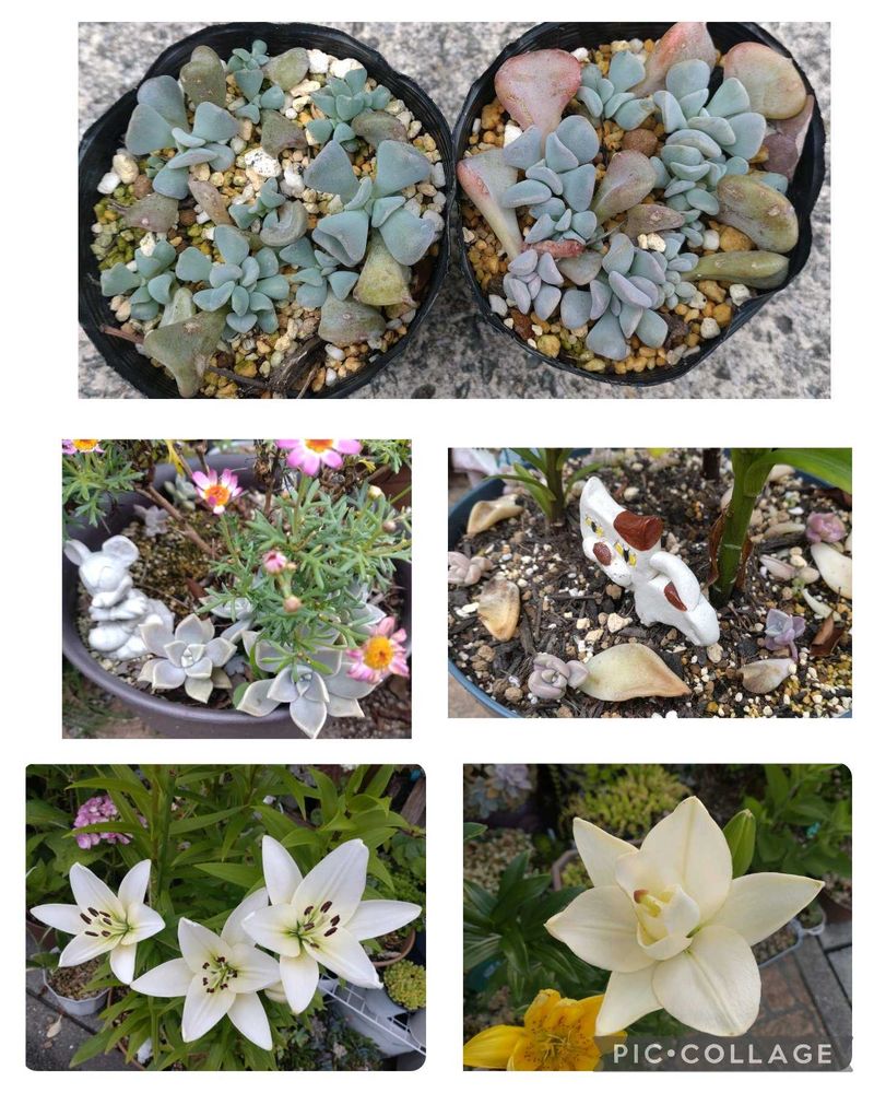 マーガレット、百合、色んな鉢の周りで朧月の葉挿しをしています。
