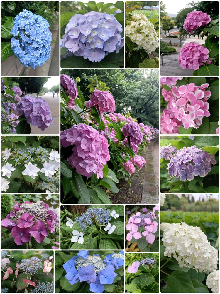 今や、「コレ紫陽花?」なんてのが出回ってますが、私は左下のヤマアジサイ風な感じのコが好きです♫
