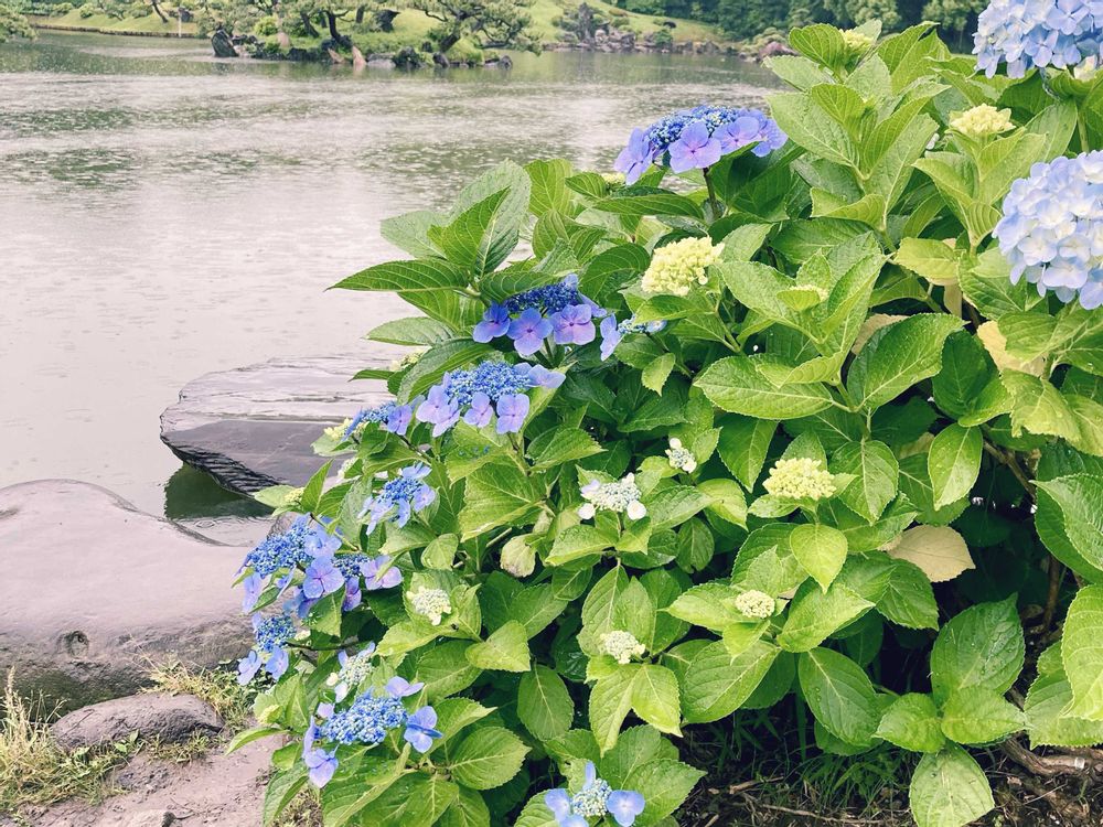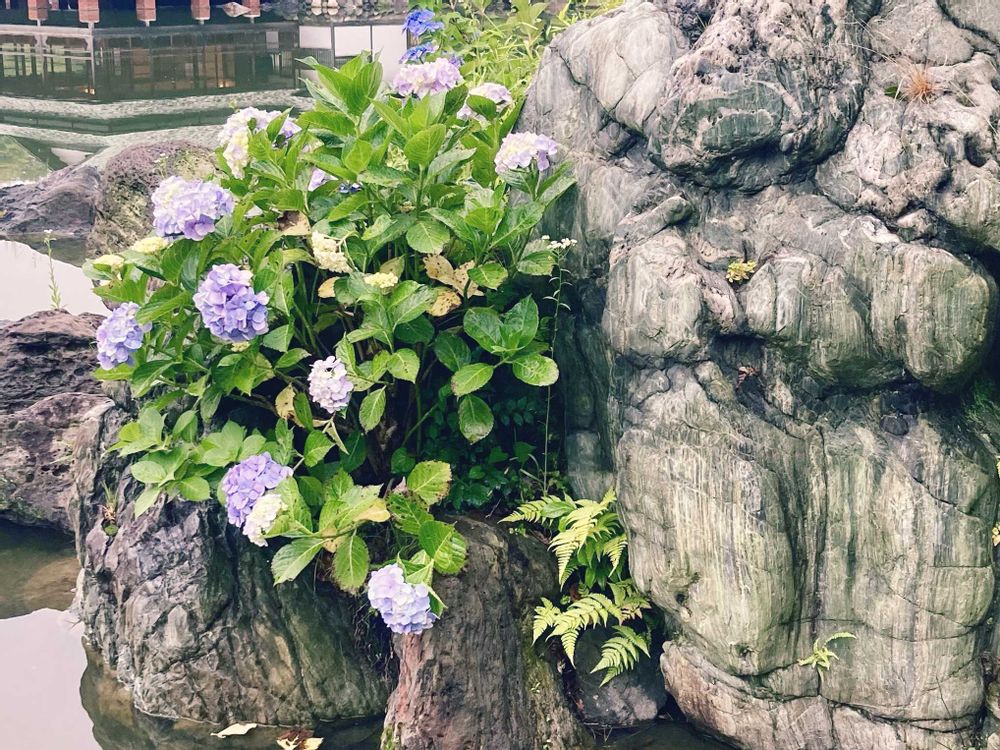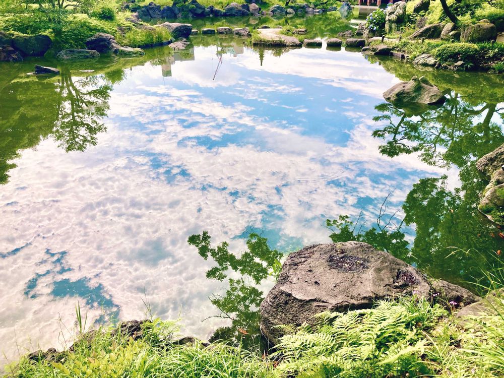 朝、大泉水に映る水鏡やアジサイを眺めながらお掃除に行ってきます❀.*・゚