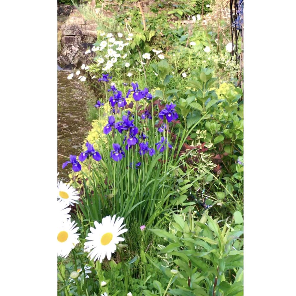 フランスギク、あやめ、アンティークカラーのテマリシモツケ、そして芽吹きカラーのナワシロイチゴの葉がハッとするほど美しい💛💜🤎💚(写真2枚目)