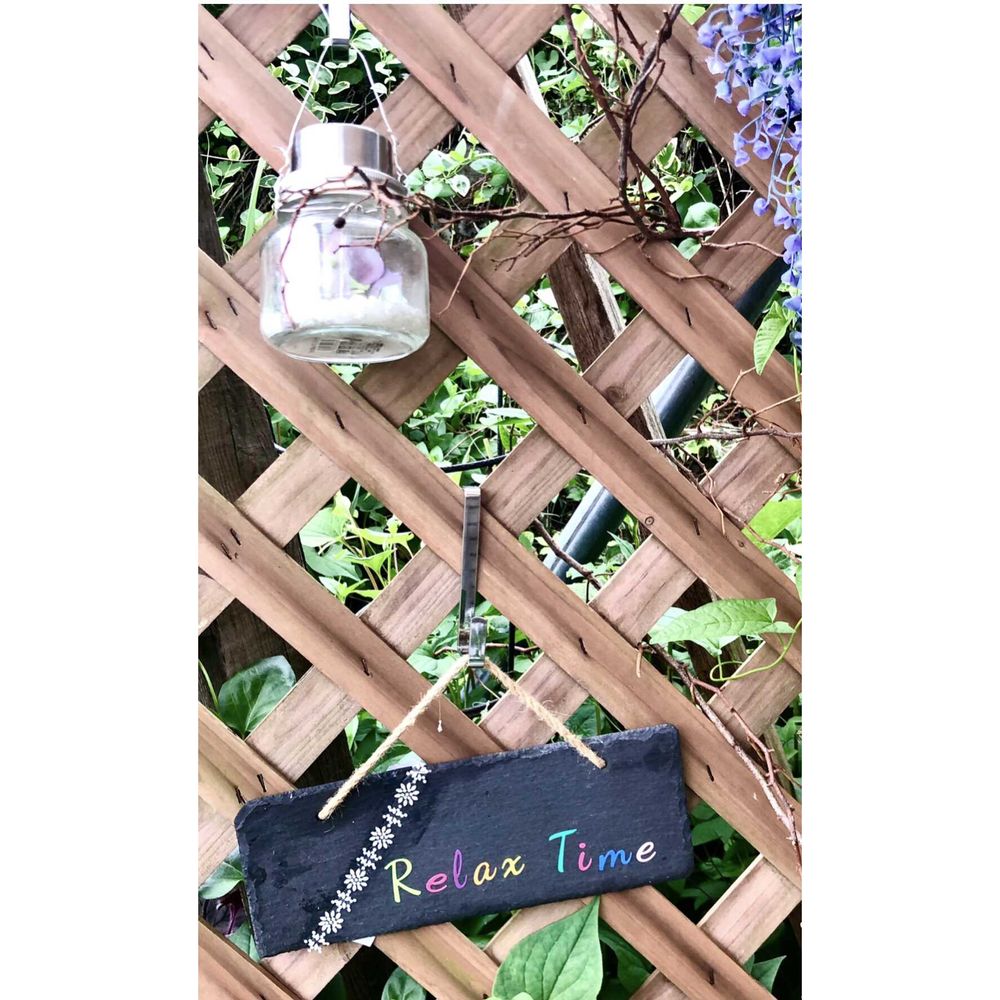 ワイルドガーデンで使っているのは、「Relax Time」の小さな看板の上に1番お気に入りのアンティークアジサイ・アメジストセージのソーラーランタン☀️☀️(写真5枚目)