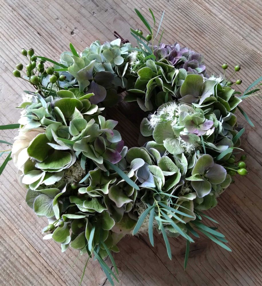 まずは、お教室で習った秋色紫陽花のリースやブーケ