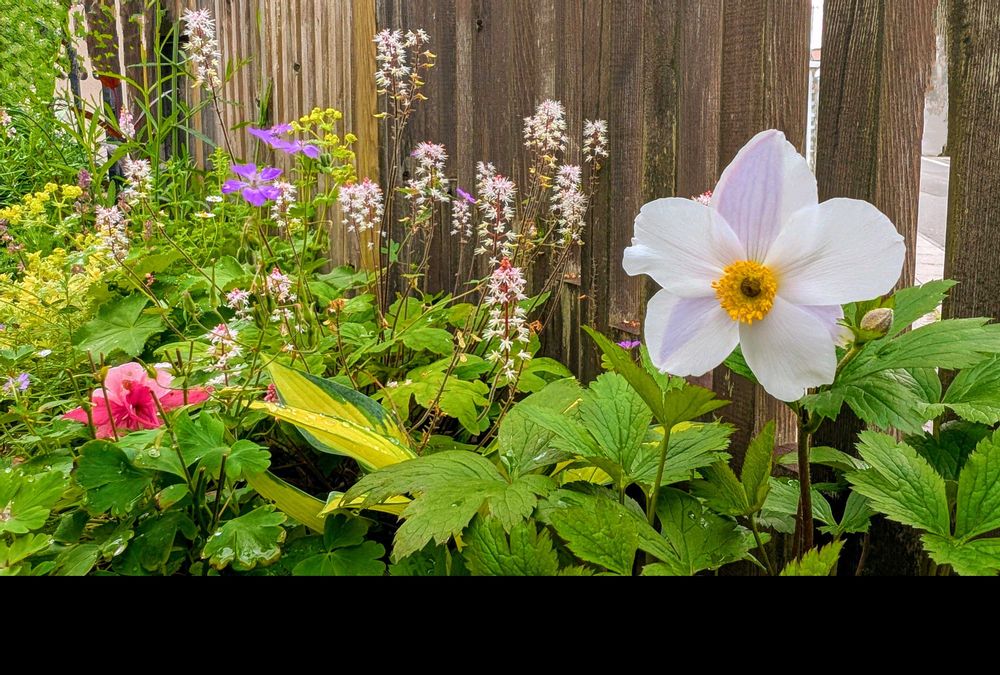 右隅がアネモネ ワイルドスワン、後ろにティアレラ スプリングシンフォニー、ゲラニウム ビルウォーリス、アルケミラモリスなど。