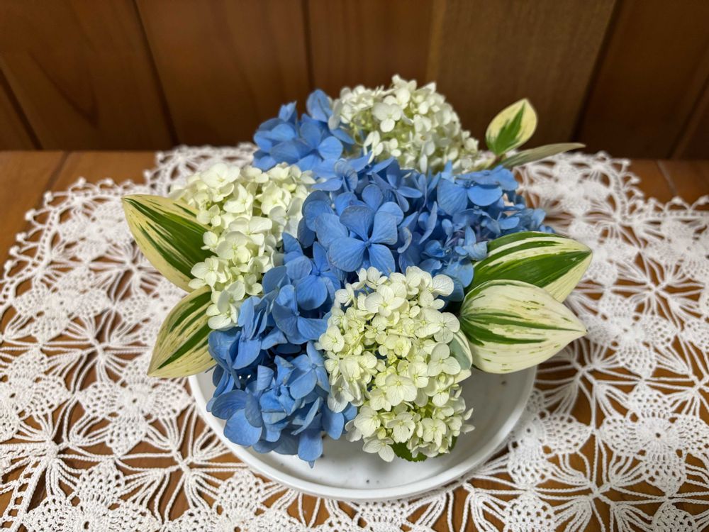 🤍アナベルと💙🩵の紫陽花をオアシスに刺してみました🎶