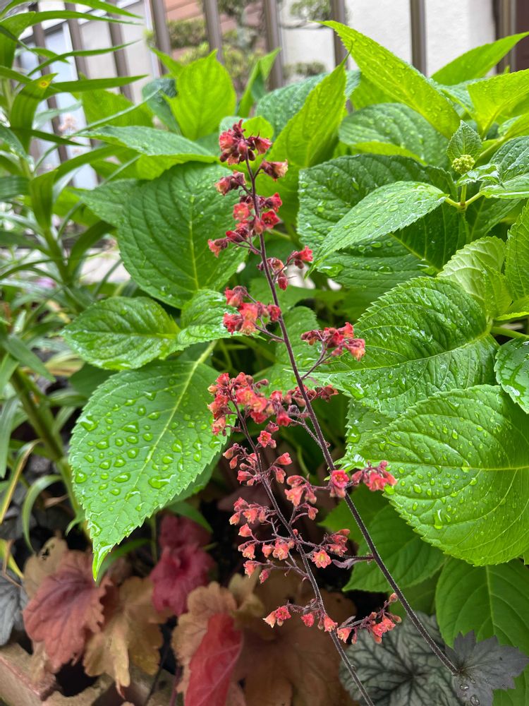 ⑤アジサイが予定より育ち過ぎて、負けそうなヒューケラ‥