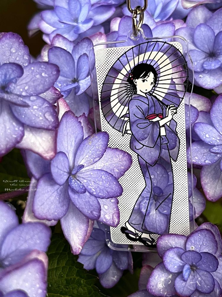 雨粒をまとった紫陽花とあやめちゃん、和傘のももこさん、とっても素敵です💙