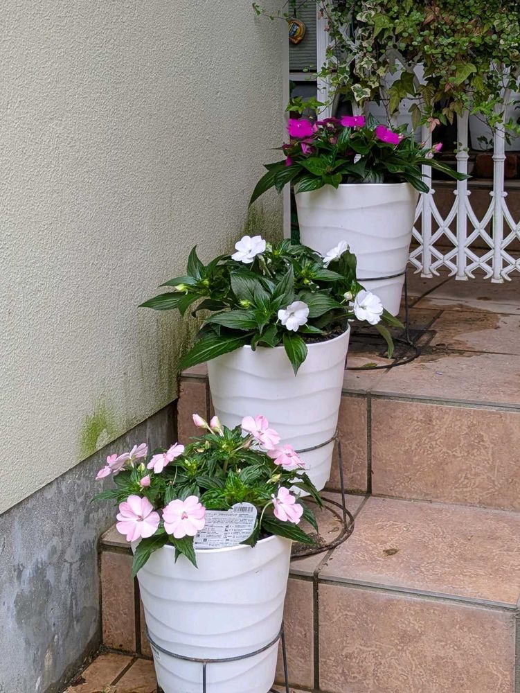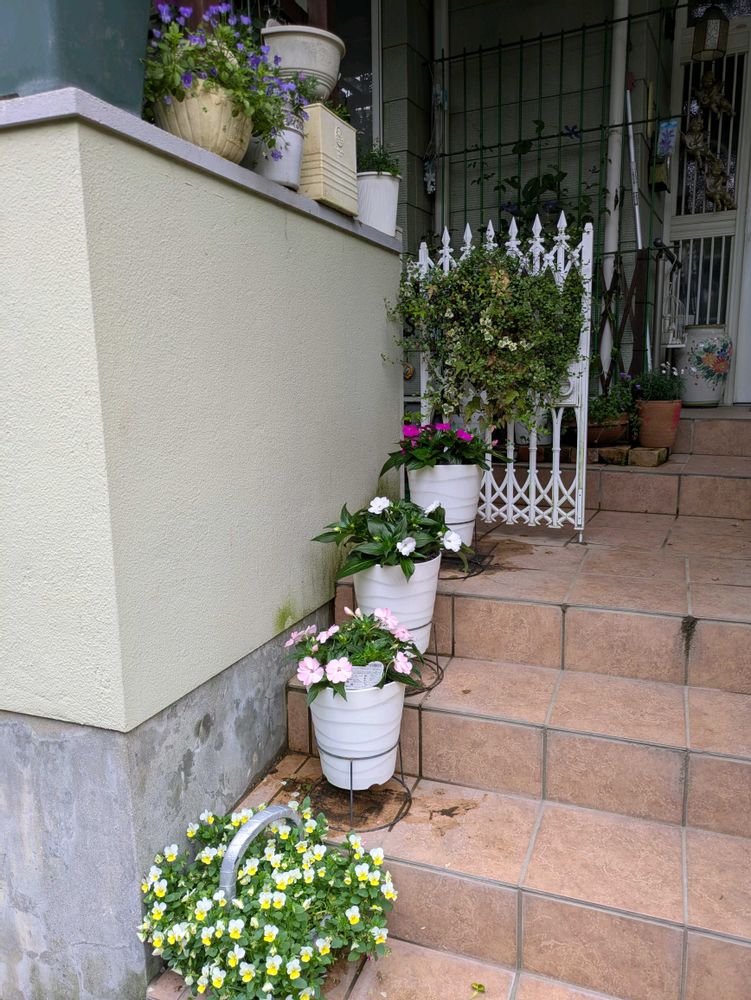 冬・春の花が終わりそうになったので、サンパティオを我が家小さな玄関階段へ移動しました。数年前にサンパチェンスを育てましたが、大きくなりすぎて、妻からサンパチェンスより小さいものなら歓迎と言われていました。